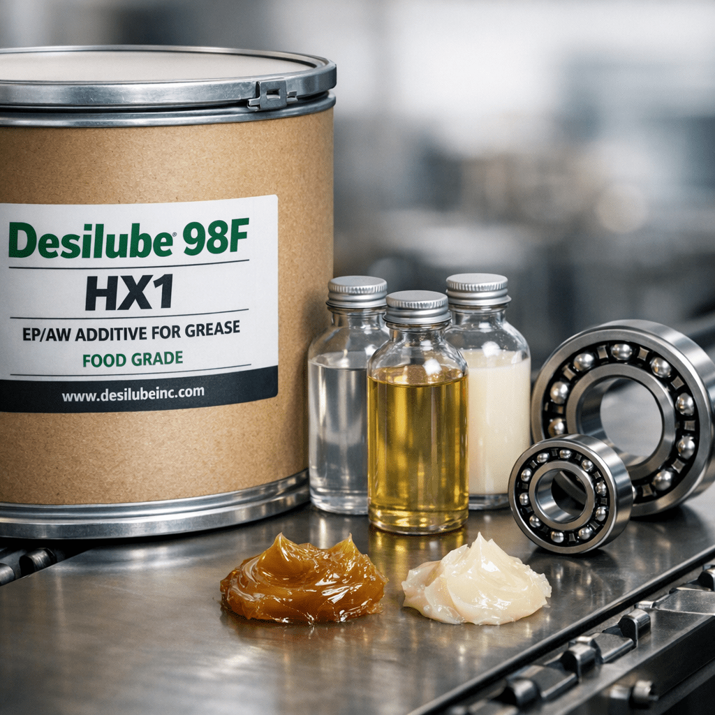 El hBN solo aborda la fricción y la estabilidad térmica. Para el rendimiento EP, Desilube Inc produce Desilube 88 y Desilube 98F — aditivos S-P aprobados por NSF HX1 al 0,5–2,5% en grasas alimentarias. Combinados con Solidex B025 hBN al 0,25–0,5%, ofrecen un sistema completo sin PTFE y sin PFAS con resistencia EP y estabilidad térmica.